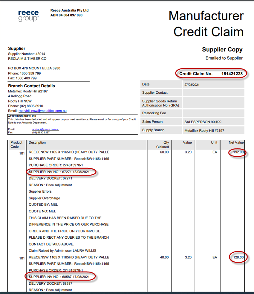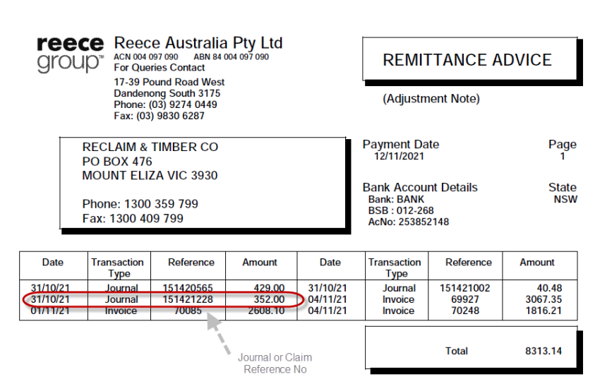 Occasionally, Reece Accounts Department may reject part of the cost of an invoice sent by Reclaim & Timber. This can be due to additional stock supplied, not quoted on the original Purchase Order, or a price variation between the price quoted in the Purchase Order and the price issued in the invoice. Once Reece Accounts Department rejects the additional charges on an invoice, they will only pay the equivalent amount from the original purchase order and issue a claim for the difference. Once the claim is dealt with between Reclaim & Timber and Reece and subsequently approved by Reece Accounts department, Reece will issue a Manufacturer Credit Claim and pay the claim. However, when the payment is made, the reference quoted in their Remittance Advice is not R&T invoice number, but Reece Journal or Claim Number. The Manufacturer Credit Claim is a document listing all claims approved in that particular payment. Therefore, the payment in their Remittance Advice may include multiple invoice short payments. To be able to reconcile Reece Remittance Advices that include Credit Claim payments, you will need copies of the Manufacturer Credit Claims, these should now be available in Hubdoc. If you can't find the relevant Manufacturer Credit Claim in Hubdoc, you can either request a copy to Reclaim & Timber Sales Department or by contacting Reece Group Accounts Payable (Non-Stock enquiries) on 03 9274 0449. Claims can take up to 3-4 months before they are approved and paid by Reece. Reece Group Remittance Advice Reece Remittance Advices display the Manufacturer Credit Claim number. This claim number may include payments of multiple claims. To be able to allocate payments correctly, you will need to view the full Manufacturer Credit Claim document.