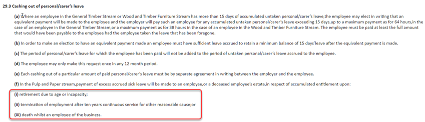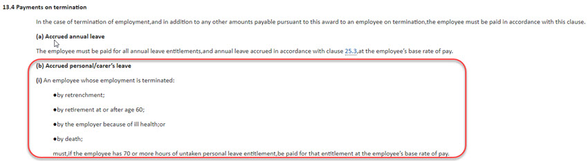 Personal/Carers Leave is generally not paid out at termination of Employment. However, Employers should always exercise due diligence and check if a specific termination type or Employment Agreement requires payment of Personal Leave at termination of Employment. Generally, personal Leave may be paid out at termination in the following circumstances: