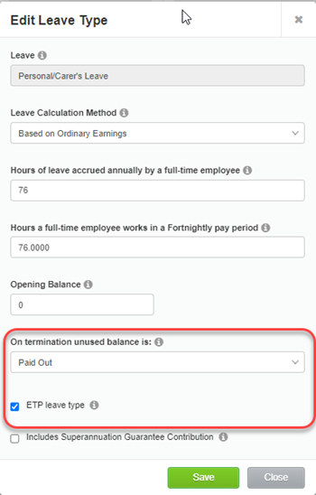 When an Award includes a provision to pay Personal Leave at termination, this clause often includes a set of conditions for the Personal Leave to be paid out. Common payment conditions include how the type of Employment termination, the number of years of Employment or the balance of Personal Leave at the time the employment ended. Examples of provisions of Personal Leave entitlements paid at termination of employment è Timber Industry Award [MA000071] - Section 29.3 Cashing out of personal/carer's leave è Black Coal Mining Industry Award [MA000001] - Section 13.4 Payments on termination Tax Treatment of Personal Leave paid at Termination of Employment When Personal Leave is paid out at Termination of Employment, this is deemed a taxable Employment Termination Payment. Therefore, the applicable ETP Tax percentage must be used when calculating the tax to withhold from the payment. Set Up Personal Leave to be paid out at Termination
